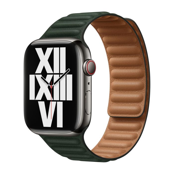 Apple Leather Link for Apple Watch in the color Sequoia Green. This strap is suitable for all 42 / 44 / 45 / 49 mm Apple Watch models.