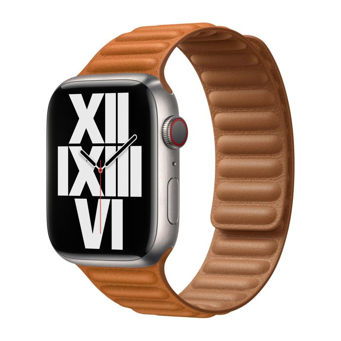 Apple Leather Link for Apple Watch in the color Golden Brown. This strap is suitable for all 42 / 44 / 45 mm Apple Watch models.