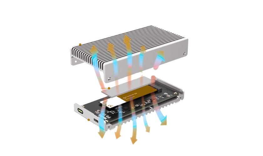 This enclosure is engineered entirely around passive thermal efficiency. The ribbed aluminum top panel, curved alloy base and dual silicone thermal pads work together to improve heat transfer up to three times compared to standard enclosures. Even during exports or large game installations, your SSD stays cool and consistently fast—without any fan noise.