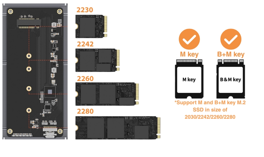 - Wide SSD support: fits NVMe M-Key and B+M Key M.2 SSDs in sizes 2230 / 2242 / 2260 / 2280, up to 8 TB capacity