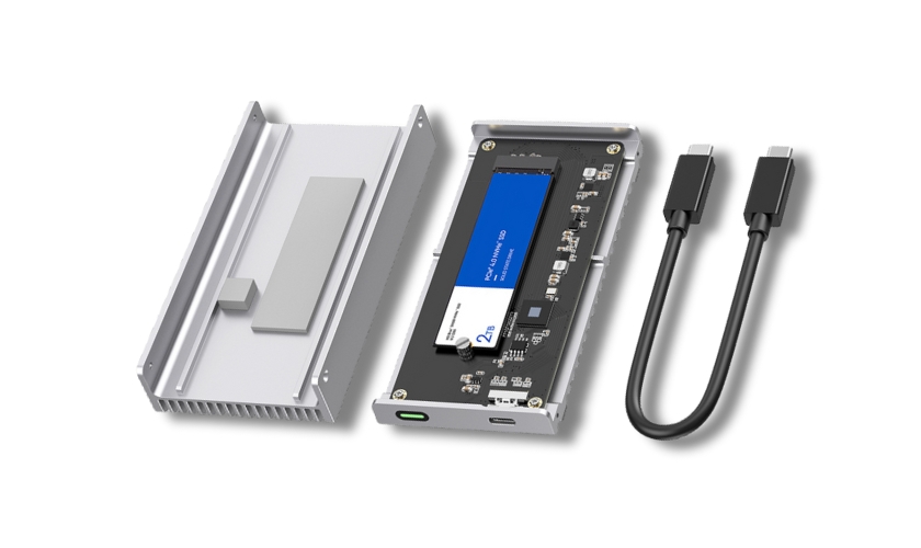Everything you need is included in the box—tools, heat pads and cable. Simply open the enclosure, insert your SSD, secure it with the screw, apply the thermal pads and close the unit. Within minutes, your high-speed external storage is ready to use.