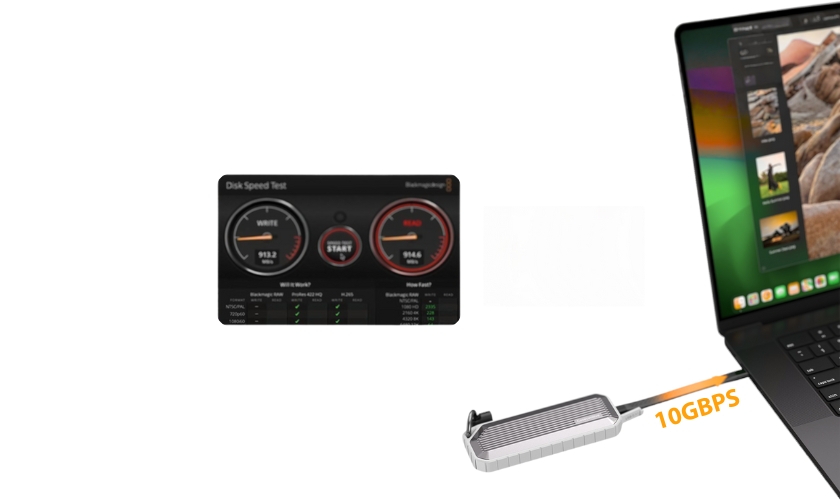 Powered by a USB4 10Gbps controller, this enclosure delivers stable transfer speeds up to around 1000MB/s. Large 4K/8K video files, RAW photo libraries and project archives can be opened, moved and edited directly from the external SSD without frustrating delays.