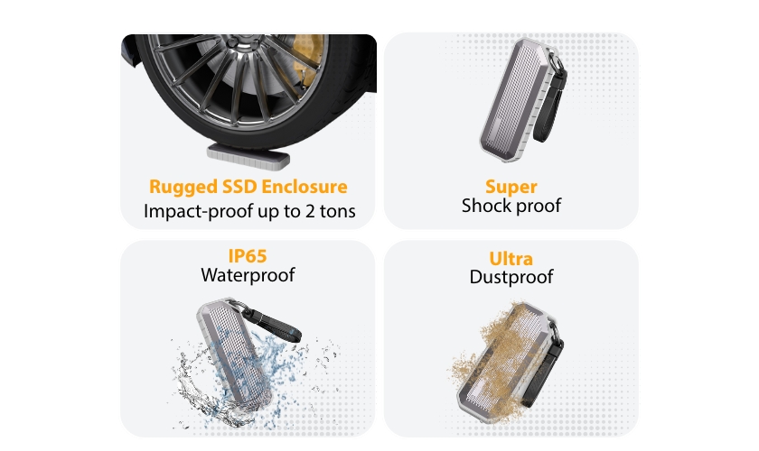 The durable, reinforced housing is engineered to keep your data safe in challenging conditions. With an IP65 waterproof rating, the enclosure withstands rain and splashes, while the fully dustproof design makes it suitable for outdoor, industrial or on-location use. The impact-resistant shell is tested up to 2 tons of pressure, and the shock-resistant structure helps protect the SSD from bumps and vibrations.