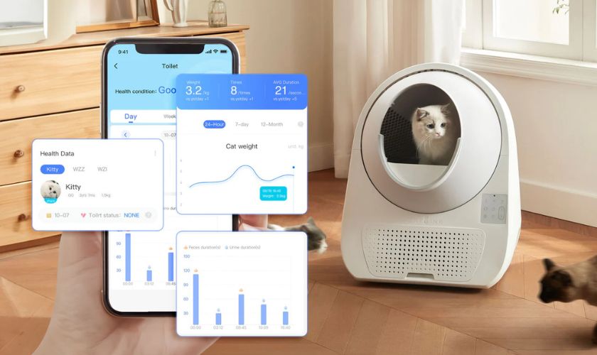 Monitor your cat's litter box habits in real-time, receive personalized health reports, and get notifications about low fill levels and full waste bins.