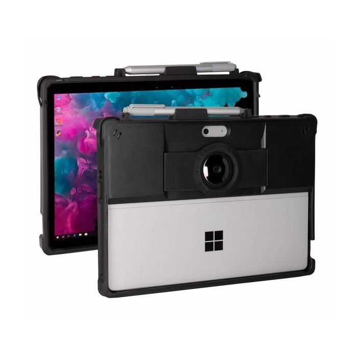 The aXtion Edge MPS case comes with an adjustable hand strap. This makes the case much easier to use and ideal for presentations. The back of the case has an open compartment, so the Surface Go's stand remains accessible.