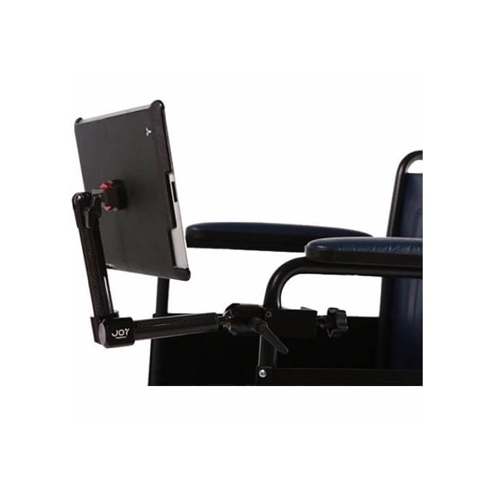 The Joy Factory MagConnect Wheelchair Mount is a holder that you can attach to a wheelchair. The mount is made of durable carbon fibre which allows it to stretch but also lightweight and resistant. With its Dual Arm Mount you can place it in any position.