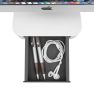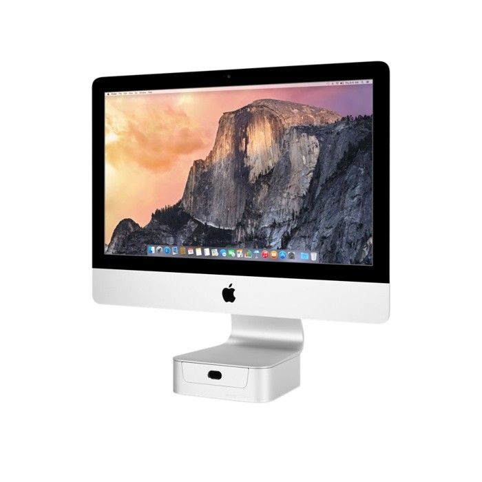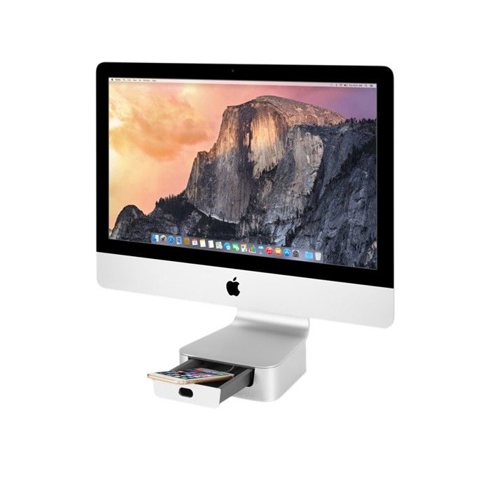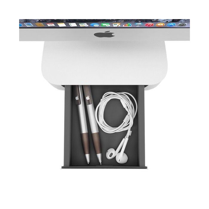 This Rain Design mBase is a minimizing stand including drawer, allowing you to work more comfortably. This stand elevates the iMac through the drawer. This allows you to pass a cable from your iPhone or iPad through the tray's hole and charge it. You can also store gadgets in the drawer for a tidy workspace. This provides a clean and tidy look. Raises the screen ergonomically to proper eye level.
