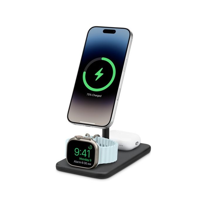 - 3-in-1 charging stand: Charge iPhone, Apple Watch, and AirPods all at once.