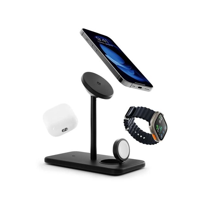 The HiRise Deluxe Magn. 3-in-1 Wireless Charging Stand from Twelve South offers wireless charging of up to 3 devices at the same time, combining performance, convenience, and design. The 3-in-1 charger has space for iPhone, Apple Watch, and AirPod cases, making it a versatile solution for all your charging needs.